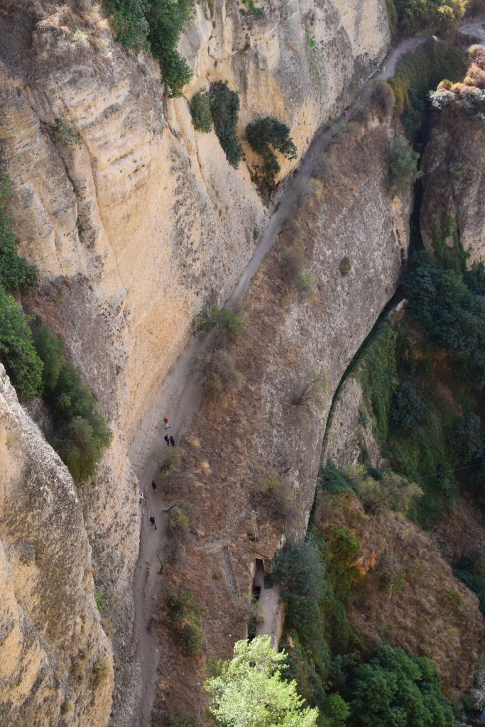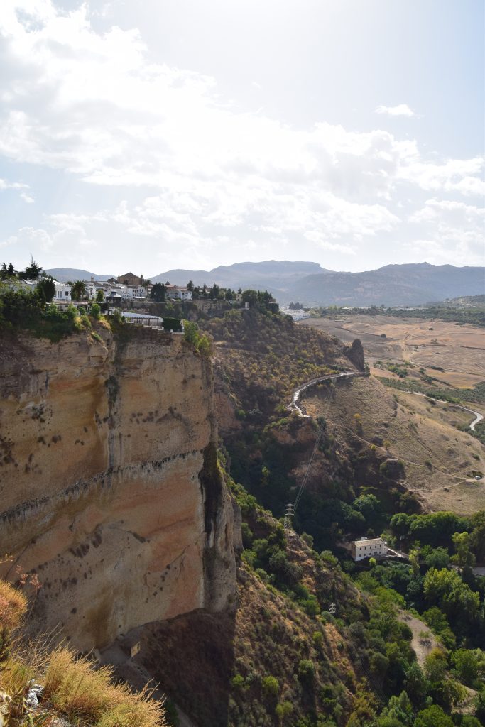 Grejen med Ronda är, förutom att den är en av de få välbevarade traditionella Andadlusiska städer, att den är belägen 740 m över havet. Och alldeles vid en ravin på 120 m, eller rättare sagt på båda sidorna om ravinen ,El Tajo. Över denna MYCKET djupa ravin går tre broar; den äldsta byggdes av romarna för ca 2000 år sedan och den nyaste blev klar 1793.