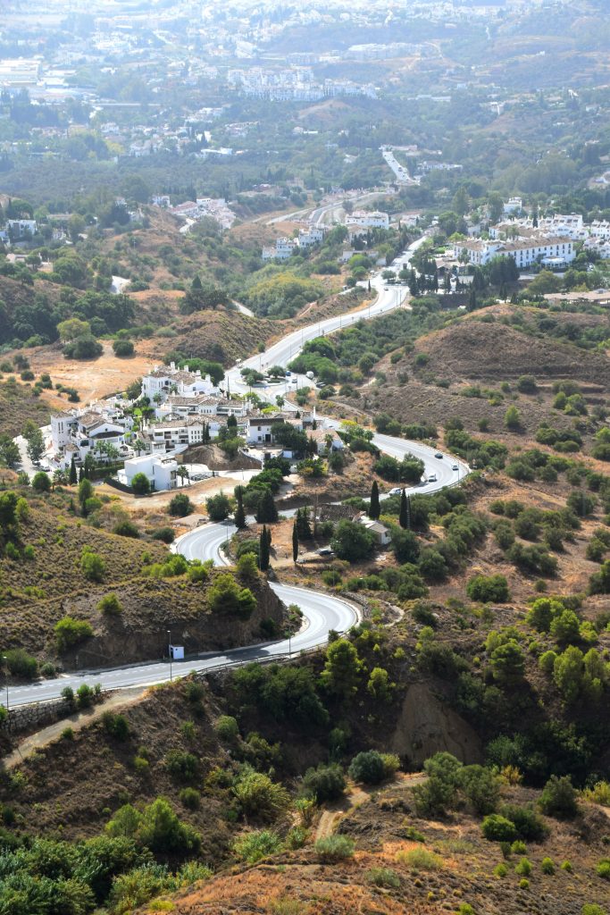 Idag tog vi oss en tur till Mijas Pueblo som är en härlig liten vit by ca.10 km från kusten. När man ser den från Fuengirola är den är placerad “mitt på berget”, som en fin, vit dekoration. Vägen dit är brant, brantare lutning än vägen till Ronda, men inte lika kuslig.
