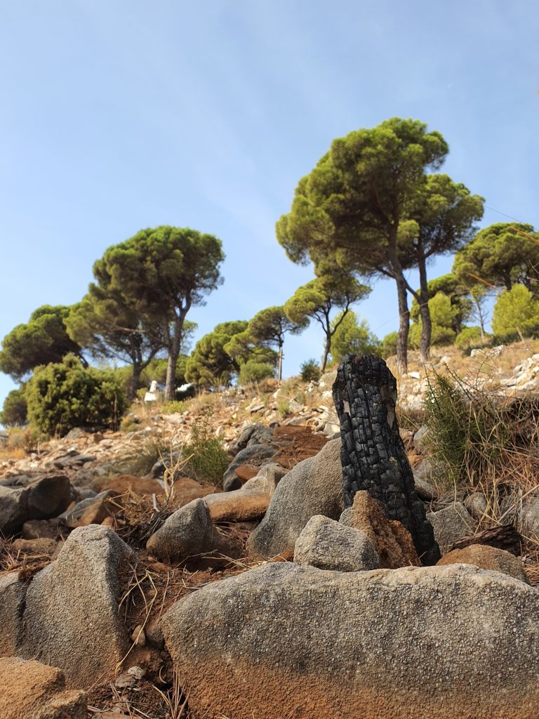 Vi ragglade ner för samma lilla steniga stig och hittad gamla sotiga stubbar som bar vittne om tidigare skogsbränder. Marken var otroligt karg men överraskande nog kunde man ändå se små blommor här och var. Jorden var terrakotta färgad och mycket torr och dammig. Den skulle lätt kunna användas som vackert pigment för färg!