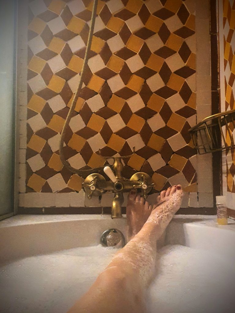 Jag började dagen med ett bad. Det var ett badkar med utan blandare så det heta och det kalla vattnet skulle muxas själv med repektive kranar; old school med andra ord (de här hade dessutom “kors- handtag” så jag vred på dem med tårna allt eftersom värmen skule justeras..). Det var något strul med proppen för vattnet minskade med jämna mellanrum, särskilt när jag satte igång bubblet…