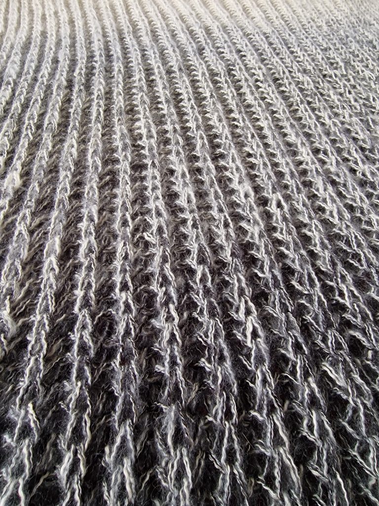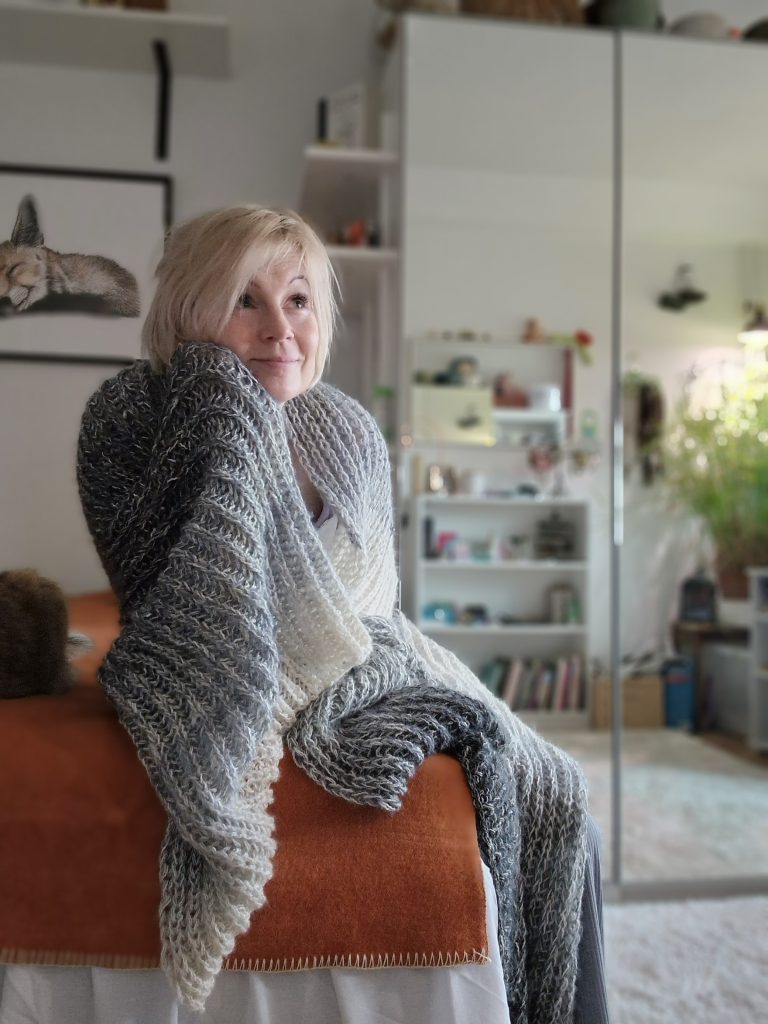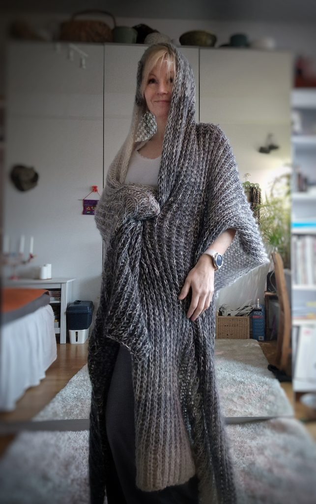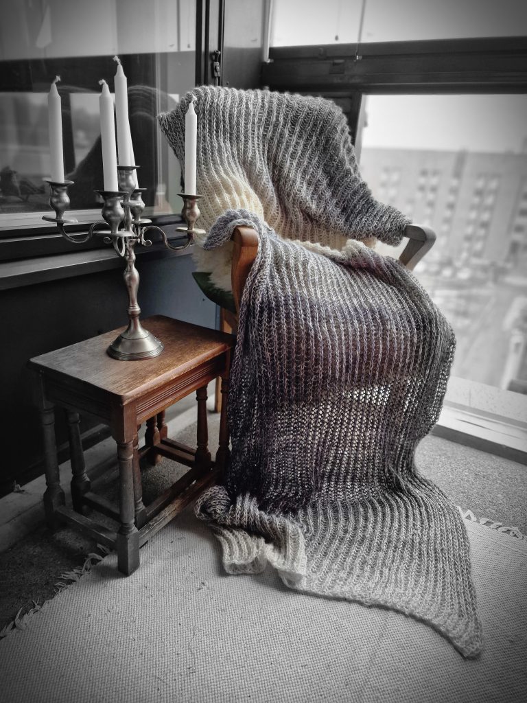 Det hade blivit över restgarn (Elegia/ Novita) från ett tidigare tröjprojekt och jag visste inte riktigt vad jag skulle göra med det… En ovanligt kulen dag så kom på att jag saknar en jättesjal att krypa in i när livet känns grått och kallt!