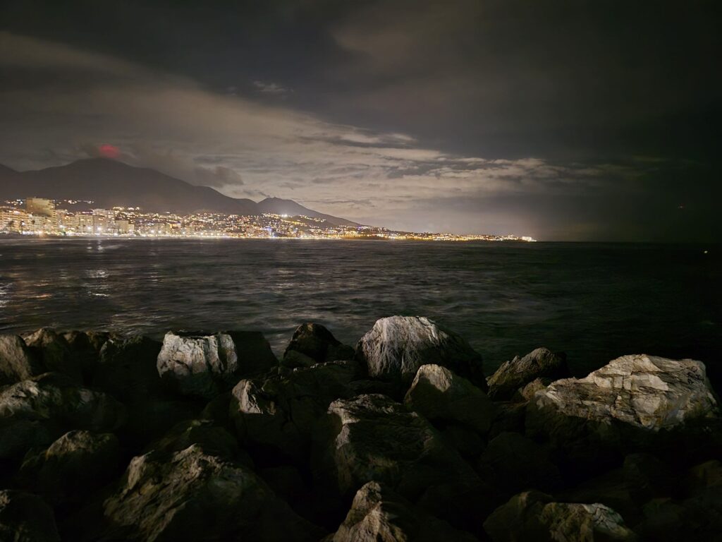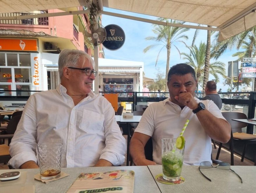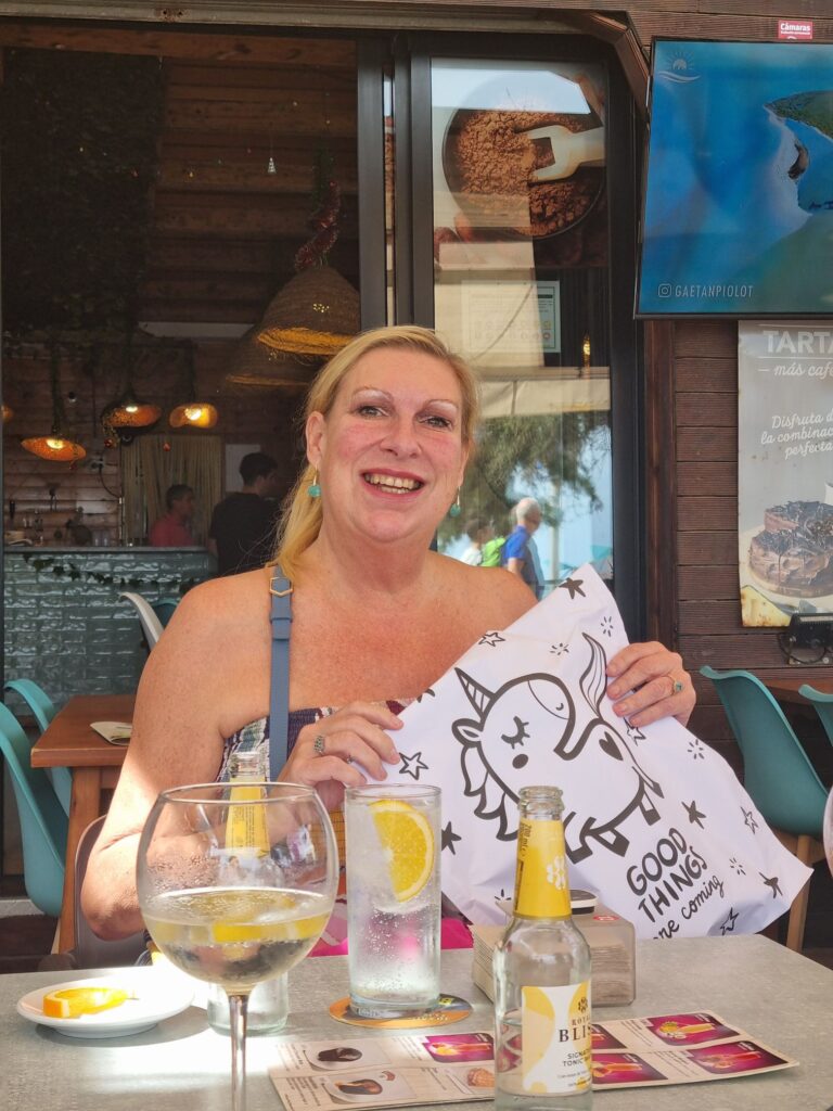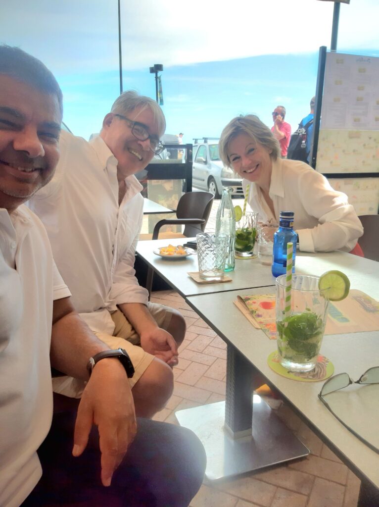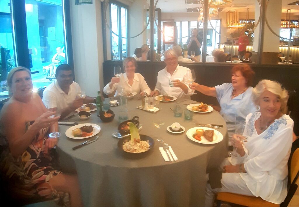 Mätta och nöjda kramade vi sedan om varandra, skickade hem Lynda, Helen och David med taxi och promenerade hemåt. Frankie plockade upp sin reparerade Iphone, som han lämnat in för glasbyte påvägen till baren. För 59€ blev hans telefon som ny!