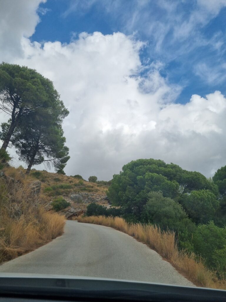 Vägen krympte ju närmare vi kom och tillslut var den lika smal som vår bil, med brant söndervittrad kant mot djupa raviner! Jag blundade, och sedan vi en gång kört fel och måste backa vägrade jag fortsätta färden och vi återvände till en tidigare parkeringsplats… Gud ske lov att ingen bil kom emot oss för då skulle vi ha blivit tvungna att backa!!